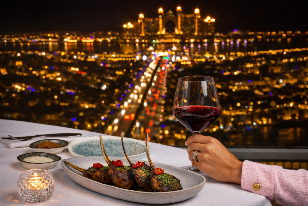 Exquisite Gourmetküche in 200 Metern Höhe mit atemberaubendem Blick über den Persischen Golf.