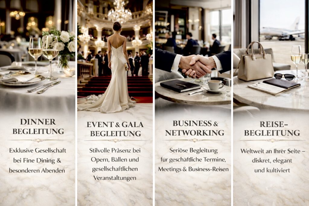 Ob als elegante Partnerin beim Dinner, als City Guide auf Ihrer Geschäftsreise oder als Reisebegleitung für unvergessliche Tage in einer neuen Stadt. Auch sportliche Aktivitäten, gemeinsame Besuche von Events oder individuelle Erlebnisse lassen sich mit der passenden Gesellschaftsbegleitung noch intensiver genießen.